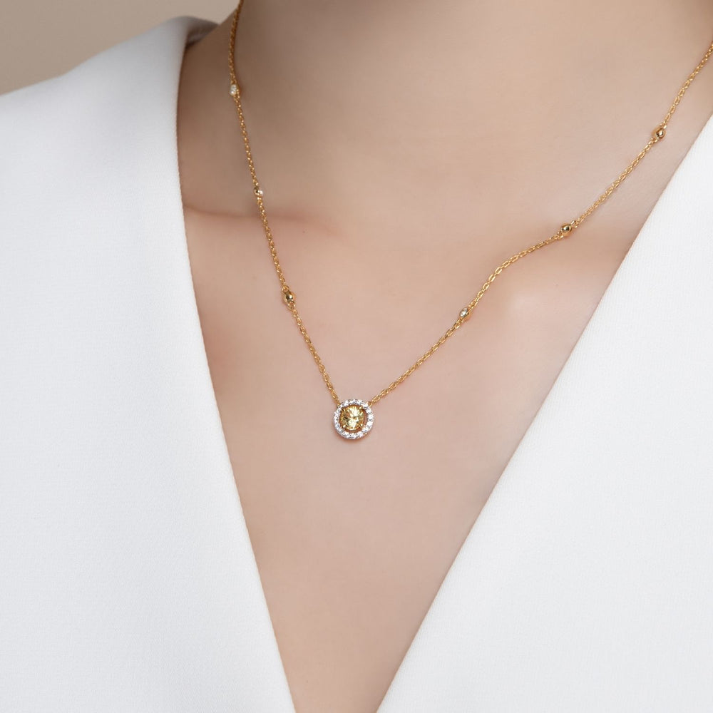 Shine with classic elegance with this pendant necklace from the Decorum collection. The necklace features a brilliant Citrine Nanocrystal in a Round Cut with a warm golden-yellow glow. The main stone is surrounded by a dazzling halo of Cubic Zirconia (CZ) stones. Crafted from 925 sterling silver and plated with 23K gold, the piece is made even more special with additional CZs set along the chain. This necklace is a perfect statement of luxurious and timeless style.