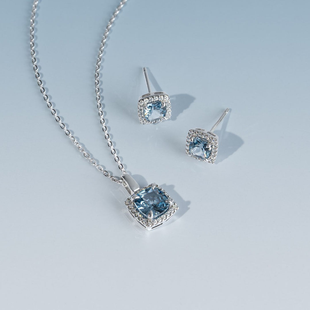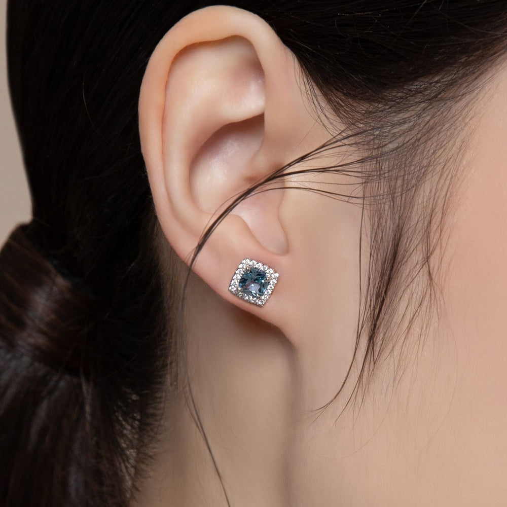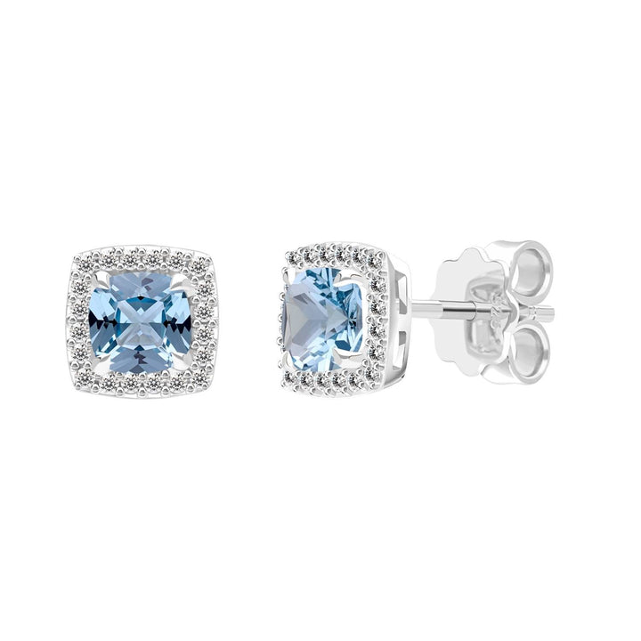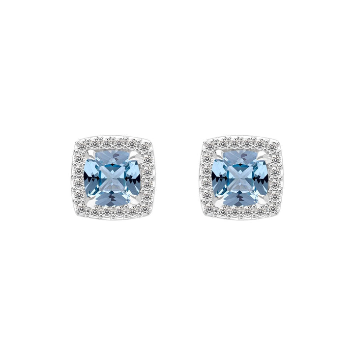Experience timeless beauty with these stud earrings from the Decorum collection. This pair is highlighted by a classic Cushion Cut Synthetic Aquamarine Spinel in a gentle light blue hue, which offers a soft yet captivating sparkle. The main stone is elegantly framed by a halo of Cubic Zirconia (CZ) stones, adding extra luxury and brilliance. Crafted from 925 sterling silver and expertly rhodium plated, these earrings are perfect for both daily wear and special occasions.