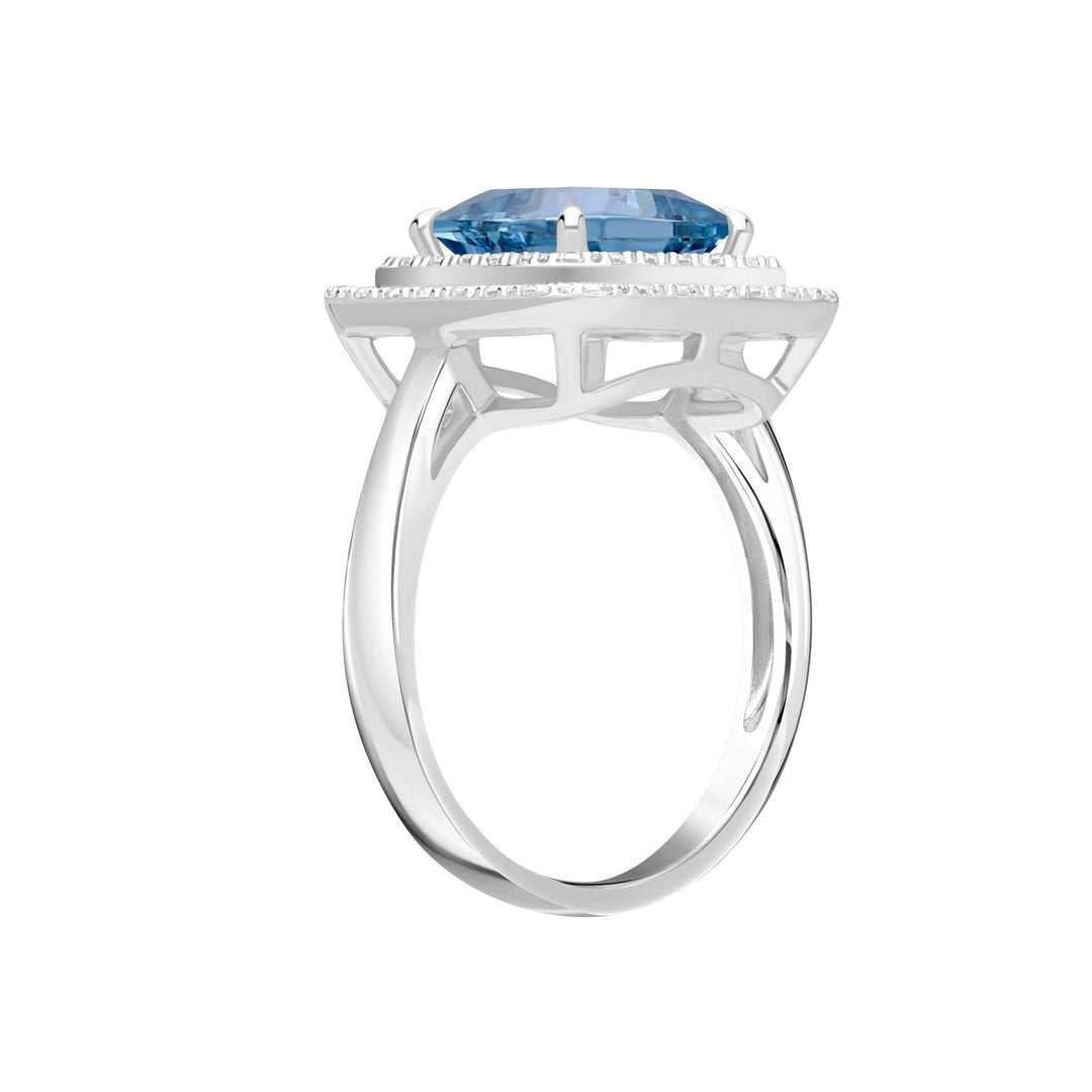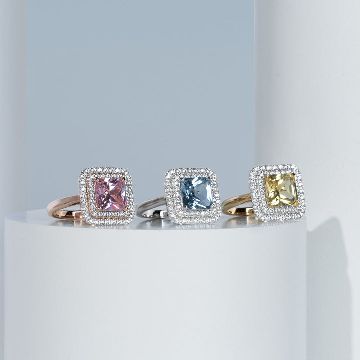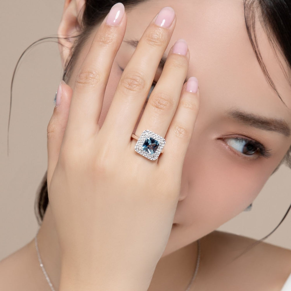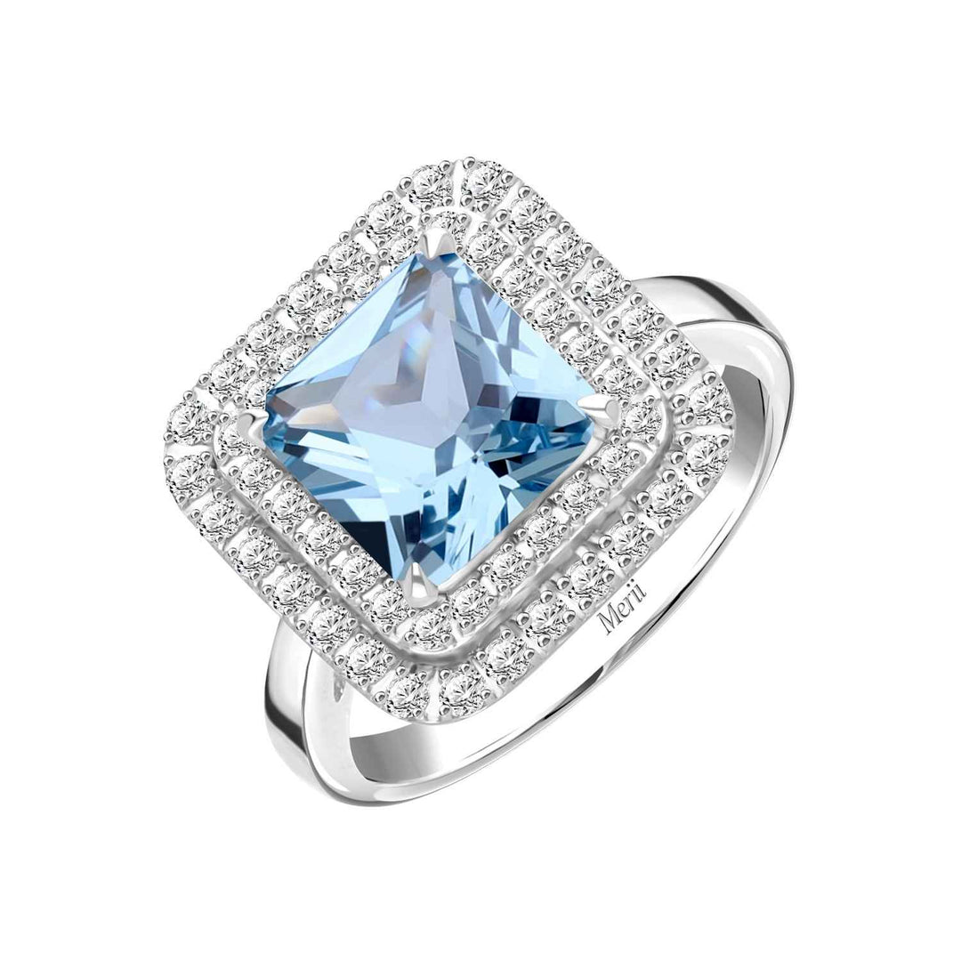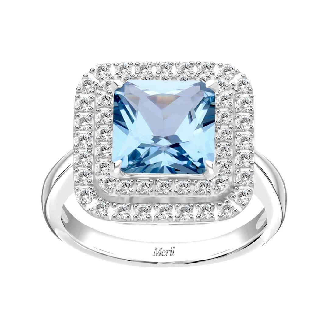 Make a bold statement of luxury with this stunning ring from the Decorum collection. This ring features a beautiful Synthetic Aquamarine Spinel in a classic Square Cut that radiates a serene, ocean-blue glow. The main stone is surrounded by a dazzling double halo of Cubic Zirconia (CZ) stones, maximizing its brilliance. Crafted from 925 sterling silver and rhodium plated, this piece offers a sophisticated and opulent look for any occasion.