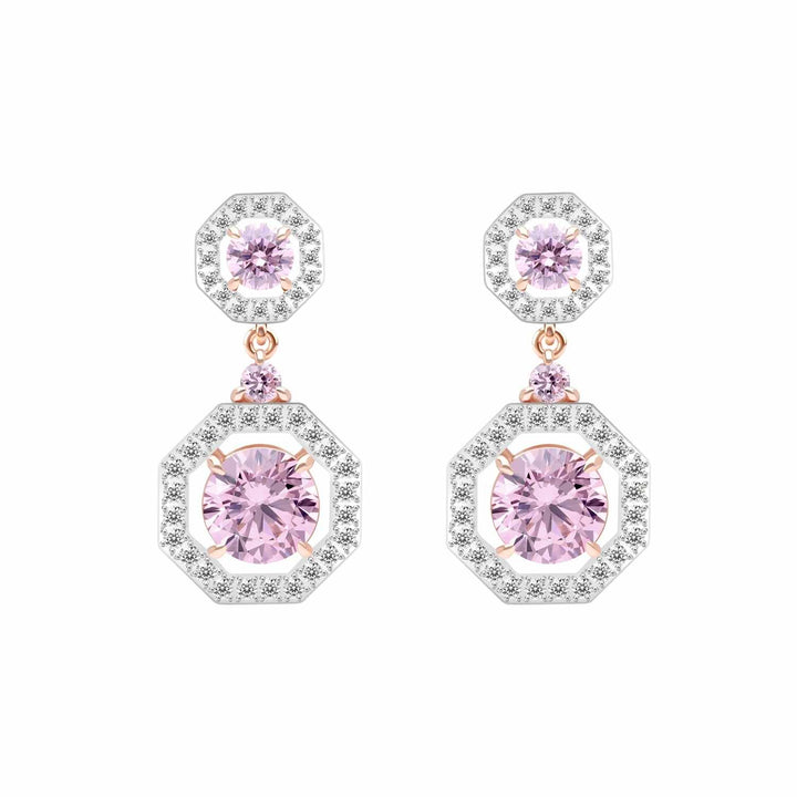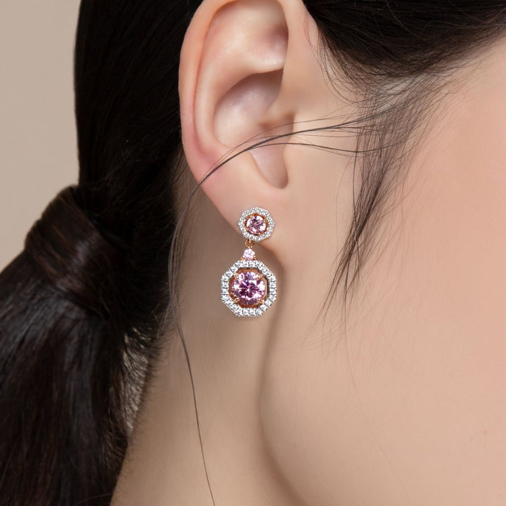 Add a touch of vibrant luxury with these drop earrings from the Decorum collection. This pair features a captivating two-tiered design, each adorned with an octagon-shaped Pink Cubic Zirconia (CZ). Both main stones are elegantly framed by a halo of smaller CZs, enhancing their brilliance. The body is crafted from 925 sterling silver and plated with rose gold, offering a look that is both sweet and sophisticated. These earrings are perfect for special occasions where you want to make a truly stylish statement.