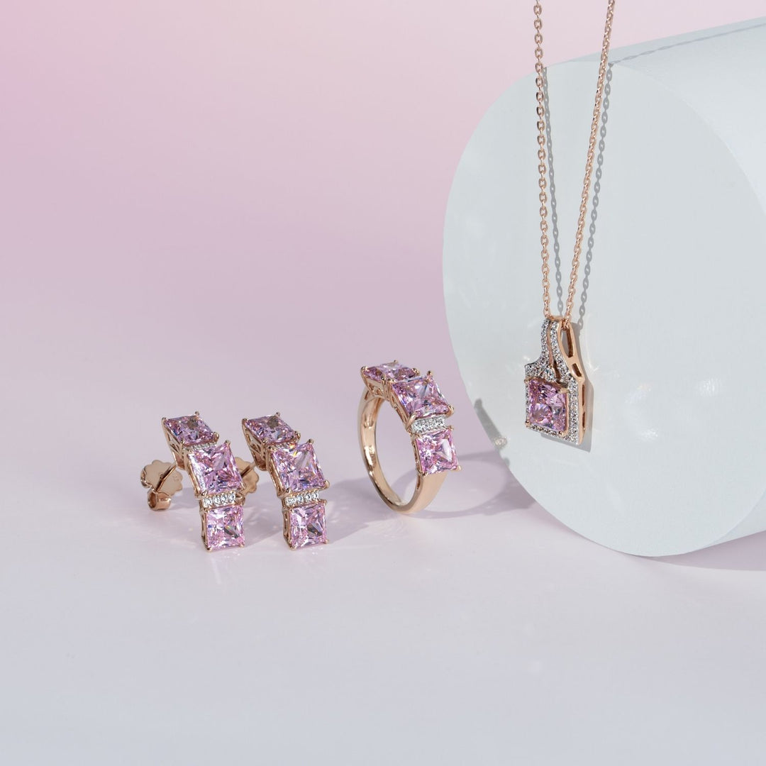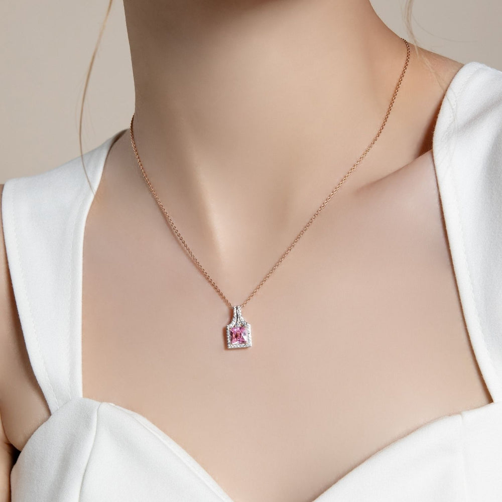 Make a sweet and striking statement with this pendant necklace from the Decorum collection. The necklace features a brilliant Pink Cubic Zirconia (CZ) stone in a precisely cut Princess Cut, set in a polished rose gold frame. The main stone is surrounded by a dazzling halo of smaller CZs, enhancing its sparkle. Both the pendant and the chain are crafted from 925 sterling silver and plated with rose gold, creating a piece that is both elegant and modern.