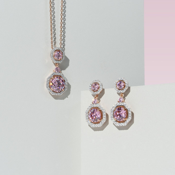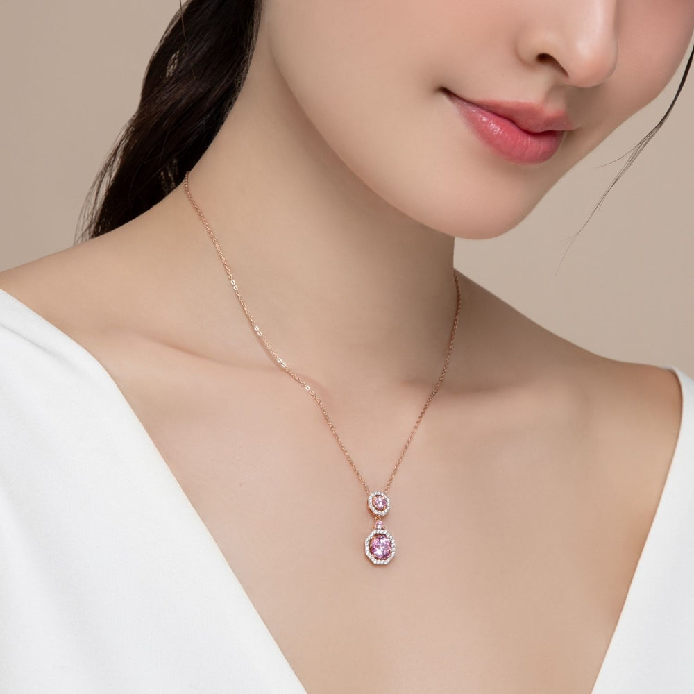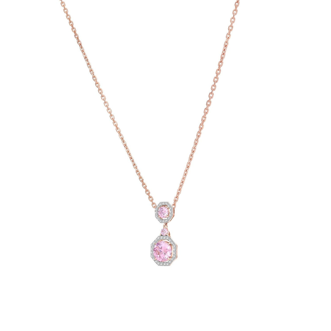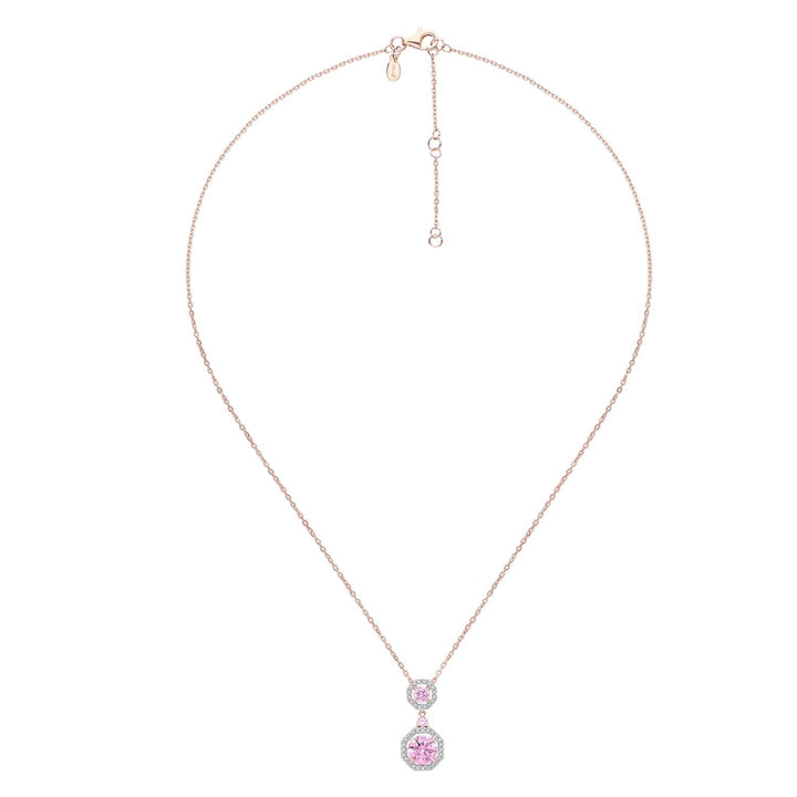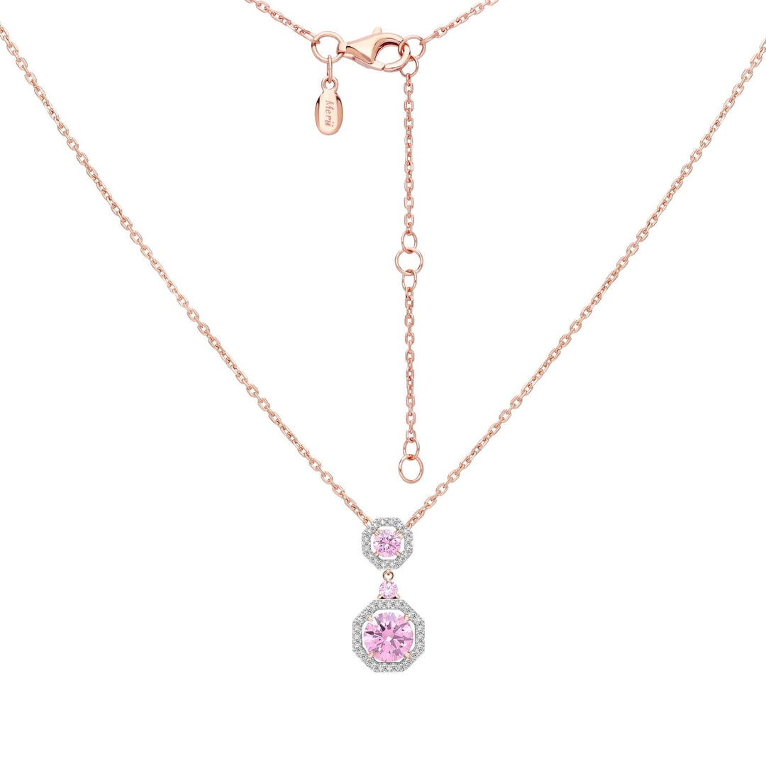 Make a sweet and striking statement with this pendant necklace from the Decorum collection. The necklace features a brilliant Pink Cubic Zirconia (CZ) stone in a precisely cut Princess Cut, set in a polished rose gold frame. The main stone is surrounded by a dazzling halo of smaller CZs, enhancing its sparkle. Both the pendant and the chain are crafted from 925 sterling silver and plated with rose gold, creating a piece that is both elegant and modern.