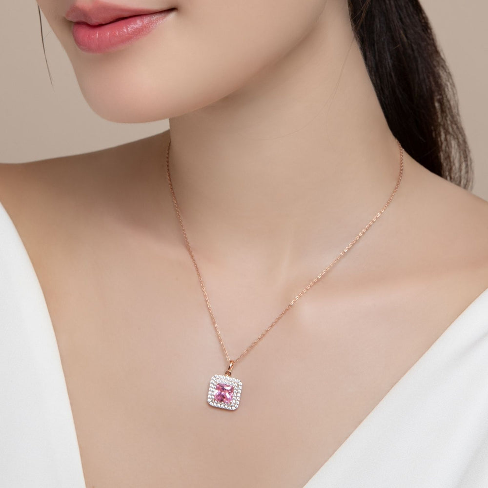 Add a touch of sweet and striking luxury with this pendant necklace from the Decorum collection. The necklace features a captivating Pink Cubic Zirconia (CZ) stone in a Square Cut, beautifully framed by a double halo of sparkling CZs to maximize its brilliance. Both the pendant and the chain are crafted from 925 sterling silver and plated with a polished rose gold finish, creating a piece that is perfect for expressing a romantic yet sophisticated style.