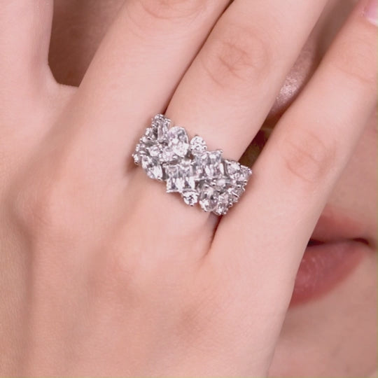 Laureate: Prepare to be the center of attention with our mesmerizing cubic zirconia ring, meticulously handcrafted from 925 sterling silver and rhodium plated. This ring is a true masterpiece, showcasing a unique blend of exquisite design and dazzling cubic zirconia multi-shaped stones.