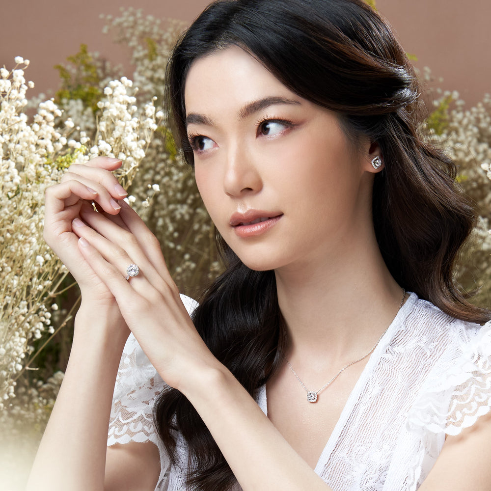 100 Cuts: Silver rhodium plated 5 mm 100 facets CZ cushion halo pendant with 16" chain necklace
