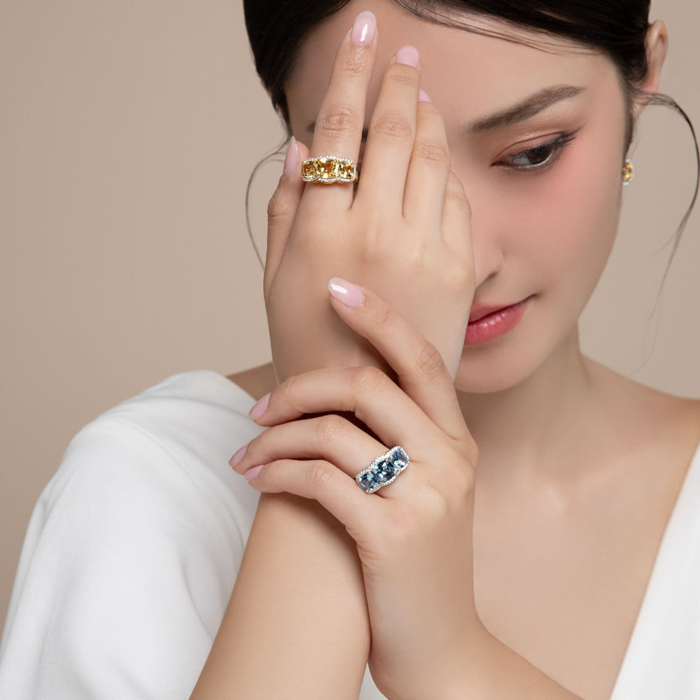 สัมผัสความหรูหราที่เหนือระดับด้วยแหวนจากคอลเลกชัน Decorum แหวนวงนี้โดดเด่นด้วย Citrine Nanocrystal ทรง Cushion ที่เปล่งประกายสีเหลืองทองถึงสามเม็ดเรียงต่อกัน ล้อมรอบด้วยรัศมี (Halo) ของเพชรสังเคราะห์ (Cubic Zirconia หรือ CZ) ที่เพิ่มความระยิบระยับตลอดแนว ตัวเรือนแหวนทำจากเงินแท้ 925 และชุบด้วยทองคำ 23K พร้อมดีไซน์แกะสลักอย่างประณีตบนตัวเรือน ทำให้แหวนวงนี้เป็นเครื่องประดับที่สมบูรณ์แบบสำหรับโอกาสพิเศษ