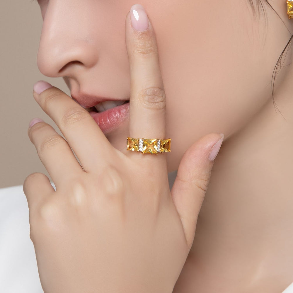 สะท้อนความหรูหราและความสง่างามด้วยแหวนจากคอลเลกชัน Decorum แหวนวงนี้โดดเด่นด้วย Citrine Nanocrystal ทรง Princess Cut สีเหลืองทองที่เปล่งประกายถึงสามเม็ดเรียงต่อกัน ประดับด้วยเพชรสังเคราะห์ (Cubic Zirconia หรือ CZ) เพิ่มความระยิบระยับระหว่างพลอยสีเหลืองแต่ละเม็ด ตัวเรือนทำจากเงินแท้ 925 และชุบด้วยทองคำ 23K มอบลุคที่ดูหรูหราและน่าหลงใหลอย่างลงตัว