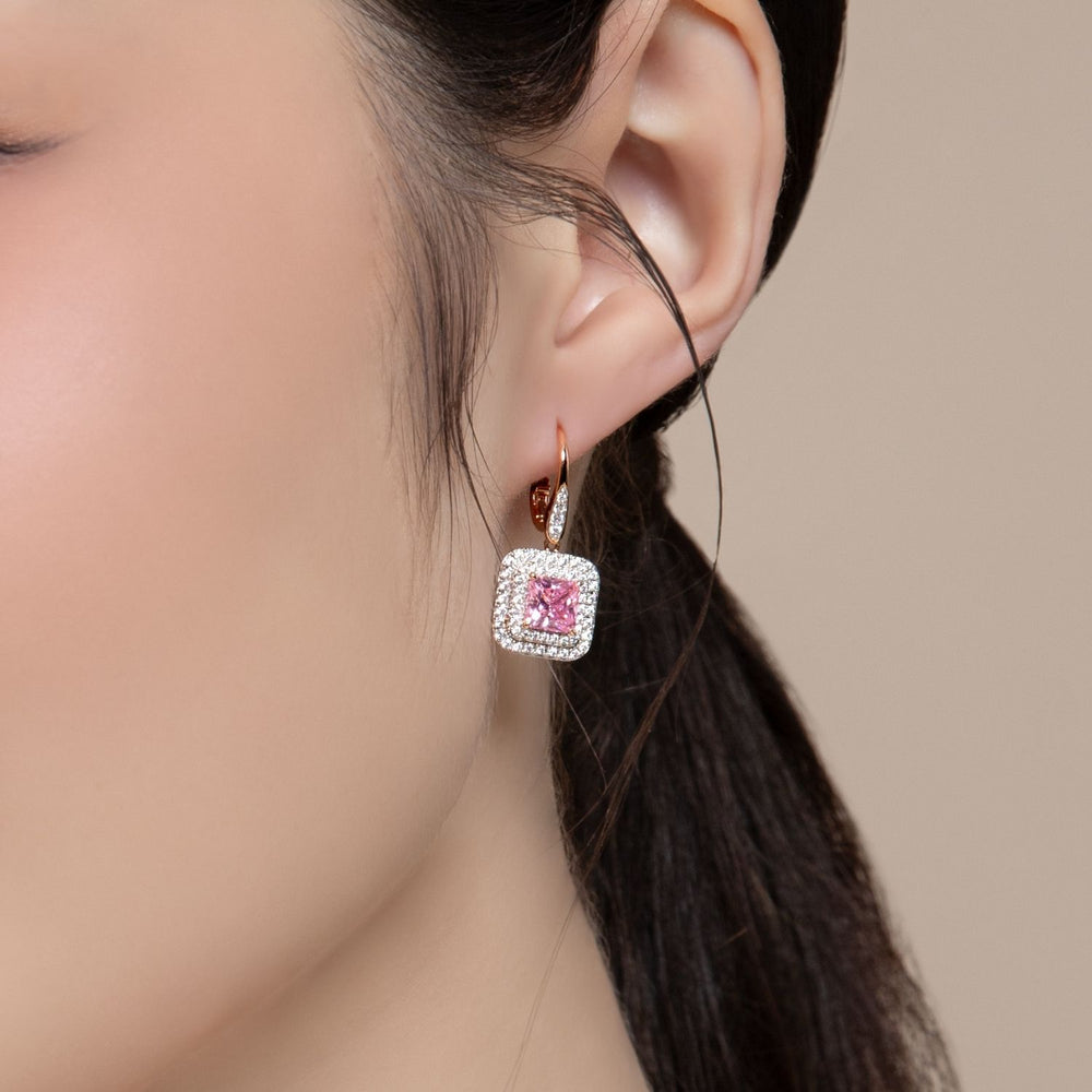 Decorum: ต่างหูเงินชุบโรสโกลด์ประดับ CZ สีชมพู ทรง Radiant Cut ล้อมเพชร CZ