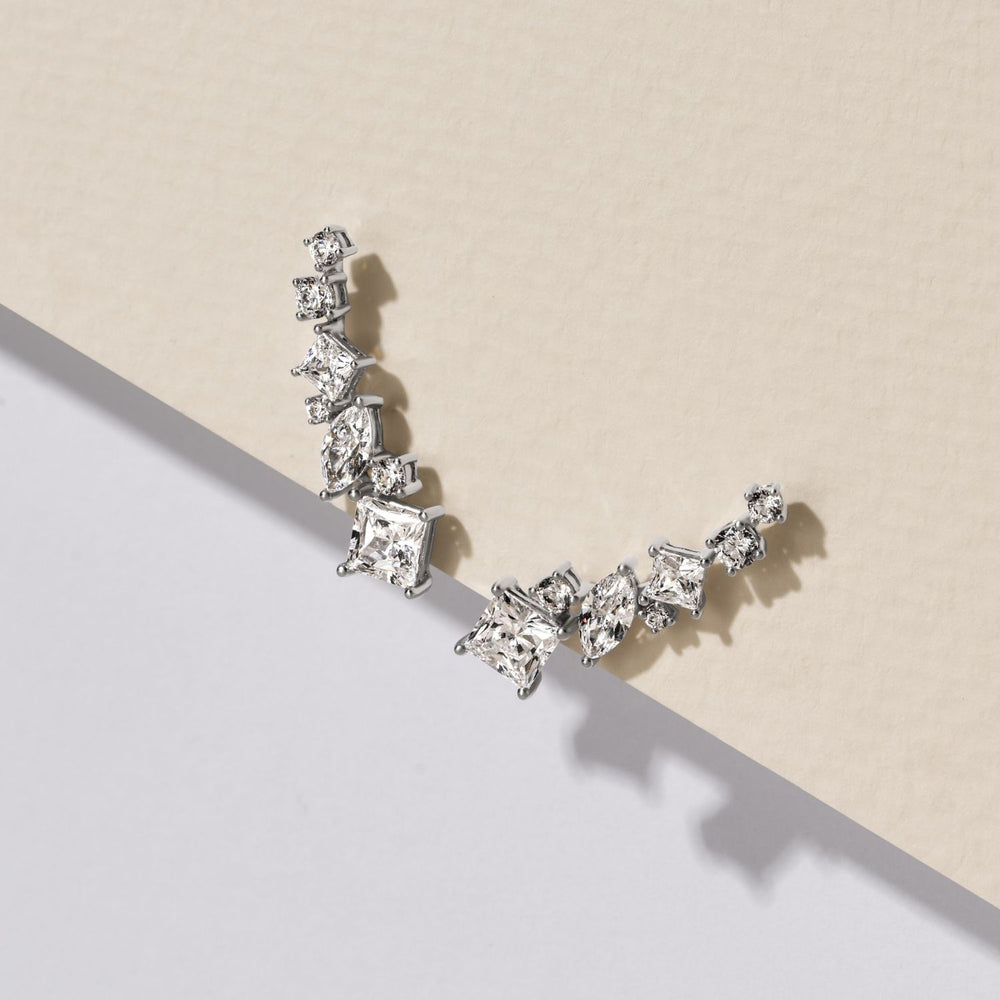 เพิ่มความทันสมัยและความโดดเด่นให้กับลุคของคุณด้วยต่างหูสตั๊ดดีไซน์ Climber จากคอลเลกชัน Laureate ต่างหูคู่นี้โดดเด่นด้วยเพชรสังเคราะห์ (Cubic Zirconia หรือ CZ) ที่เจียระไนแบบ Princess Cut อันเป็นเอกลักษณ์ เรียงตัวสวยงามพร้อมกับ CZ รูปทรงอื่น ๆ อย่างมีมิติ ตัวเรือนทำจากเงินแท้ 925 และชุบโรเดียมอย่างดีเยี่ยม มอบประกายแสงที่เจิดจรัสสะท้อนถึงรสนิยมที่หรูหราและมีสไตล์