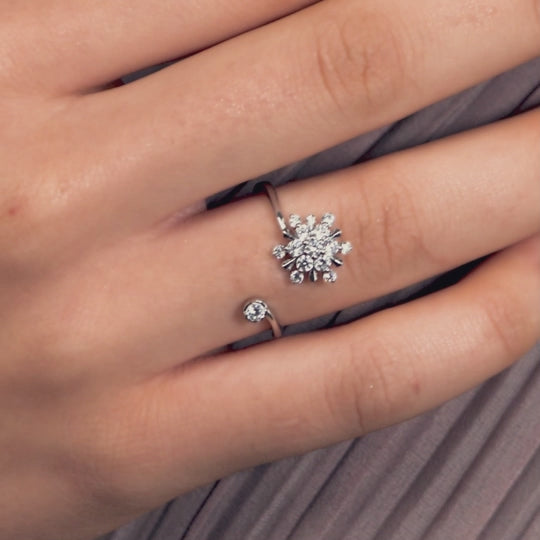 Snowflakes: แหวนเงินชุบโรเดียมประดับ CZ ดีไซน์ผลึกหิมะ ทรงแหวนเปิด